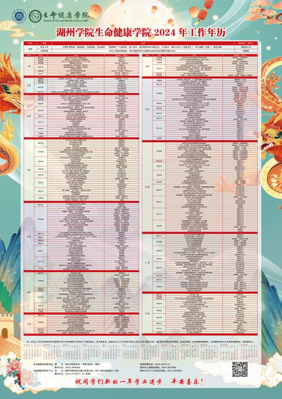 “凡事预则立,不预则废”。为帮助学生更好的规划新一年的学习、工作和生活,生命健康学院精心设计了“9001jcc金沙以诚为本生命健康学院2024年工作年历”,将全年的教学工作、学科竞赛、考级考证、社会实践、就业升学、评奖评优、文体活动等多方面的工作进行了全面的梳理,制作成大幅海报送给全体学生作为新年礼物,帮助学生提前了解学校、学院年度主要事务,做好前期准备工作。